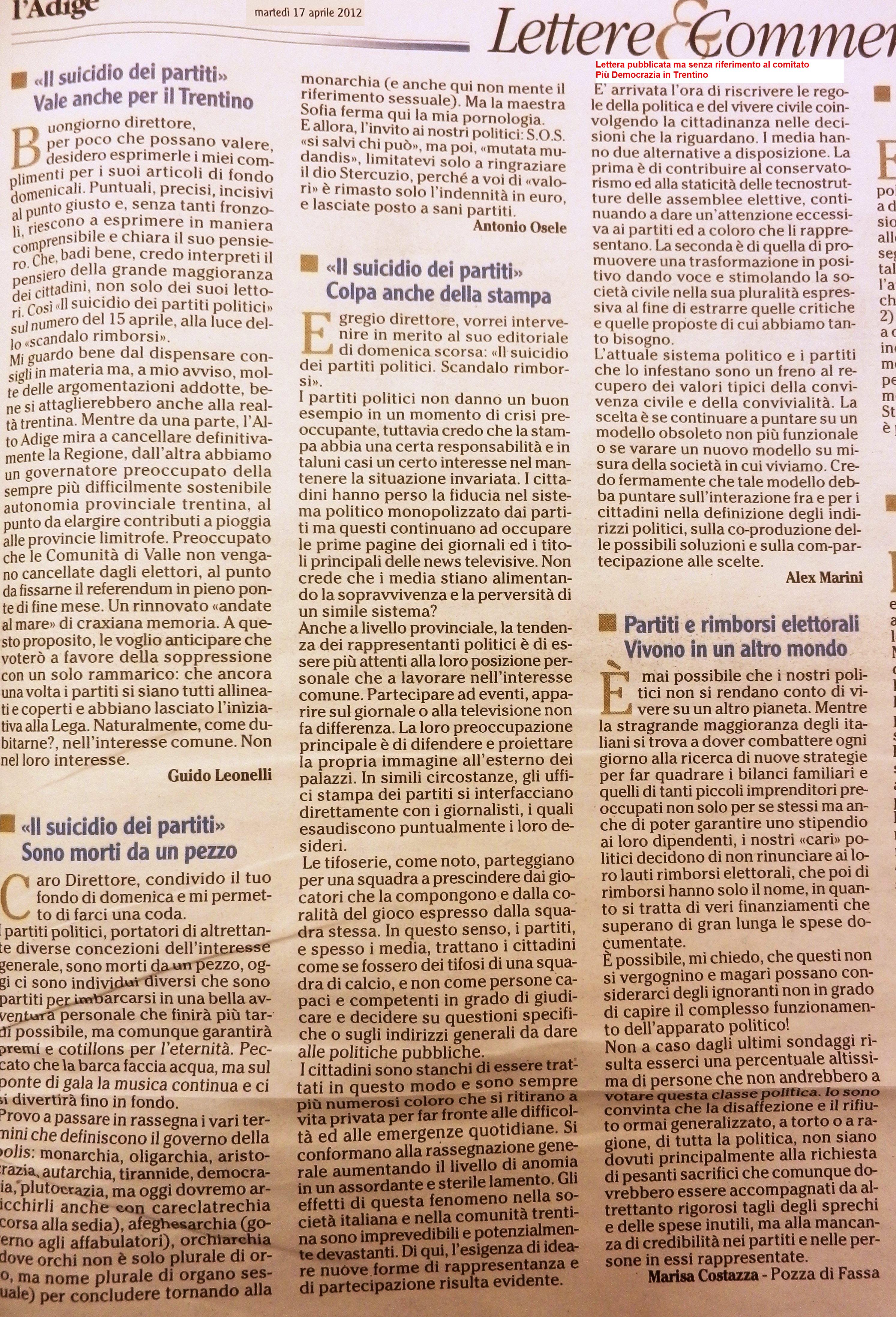 Lettera inviata al direttore del giornale L’Adige, Sig. Pierangelo Giovanetti, in risposta all’editoriale pubblicato domenica 15 aprile 2012