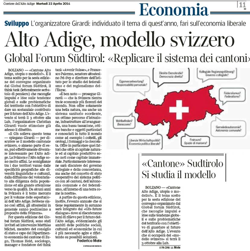 PS. Il 3 ottobre 2014 a Bolzano si terrà la sesta edizione del Global Forum Südtirol che avrà come oggetto prioprio il sistema economico dei Cantoni svizzeri.