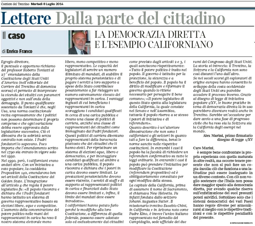Se nei secoli scorsi gli esploratori di origine europea hanno consentito lo sviluppo della costa occidentale degli Stati Uniti ora potrebbe accadere il processo inverso. Grazie al disegno di legge di iniziativa popolare 1/XV, le buone pratiche in tema di democrazia diretta là in uso potrebbero diventare realtà anche in Trentino. Sarebbe un’occasione per dare avvio ad una fase di progresso civile che ha reso sia la Svizzera e che la California degli esempi nel mondo.