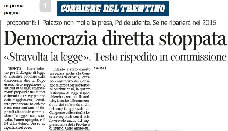 - Democrazia diretta, legge rinviata al 2015. Il comitato chiede e ottiene il ritorno in commissione. «Si pronunci l’Europa» di A. Papayannidis, Corriere del Trentino