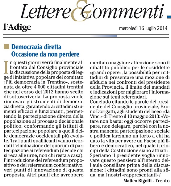 - Democrazia diretta. Occasione da non perdere di Matteo Rigotti su L’Adige
