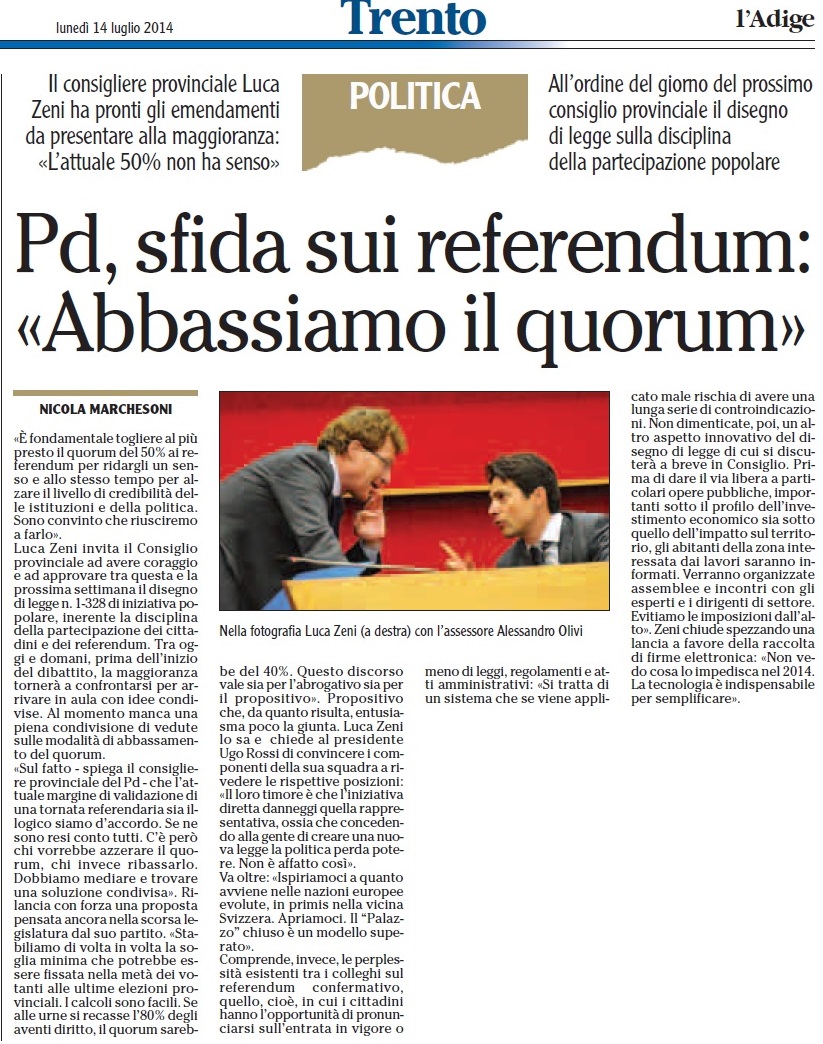 - Il 15 luglio, nell’articolo Referendum, il Pd spinge, L’Adige si ribadisce l’unica apertura che il Partito Democratico, all’unanimità dei consiglieri, è disposto a fare nei confronti dell’iniziativa popolare. Si tratta della diminuzione del quorum al cinquanta percento dei votanti alle ultime elezioni. Viene riportata anche la posizione dell’assessore Daldoss, il quale è scettico sull’uso del referendum e sostiene che bisogna “porre un filtro fra l’emotività delle persone e la necessità che su certe posizioni la politica possa prendere strade non maggioritarie”
