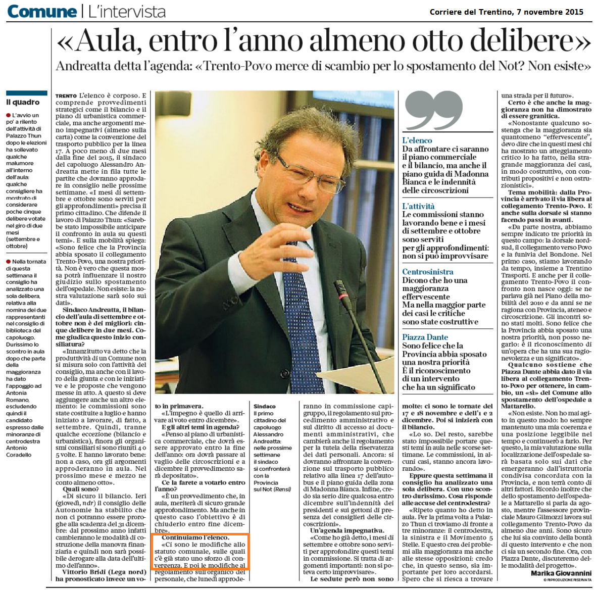 - 7 novembre – il sindaco Andreatta in un’intervista rilasciata Marika Giovannini del Corriere del Trentino afferma: “ci sono le modifiche allo statuto comunale, sulle quali c’è già stato uno sforzo di convergenza”. Rispetto alle dichiarazioni di Andreatta in campagna elettorale la situazione non sembra essere cambiata poiché le dichiarazioni si basano sull’assenza di argomenti oggettivi a sostegno della negazione alle proposte per democratizzare la carta statutaria.
