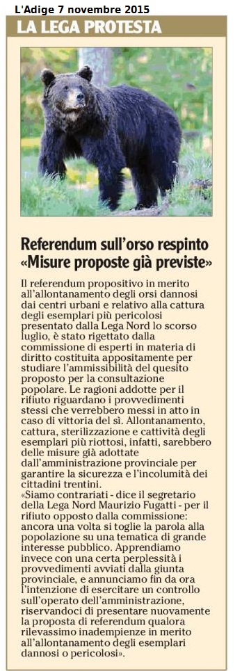 La commissione referendaria per la valutazione dell’ammissibilità del quesito referendario sulla limitazione della presenza degli orsi in Trentino ha cassato definitivamente l’iniziativa promossa dalla Lega Nord del Trentino. La decisione è stata presa il 5 novembre 2015 a conclusione di un iter iniziato nel luglio scorso e che è stato dettagliato nel verbale di deliberazione n.1 verbalizzato dal dirigente del Consiglio provinciale Camillo Lutteri e sottoscritto dal presidente della commissione Matteo Cosulich.