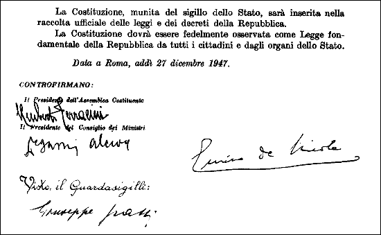 L’Assemblea Costituente della Repubblica italiana, composta di 556 deputati, fu eletta il 2 giugno 1946 e si riunì in prima seduta il 25 giugno nel palazzo Montecitorio. L’Assemblea continuò i suoi lavori fino al 31 gennaio 1948. Durante tale periodo si tennero 375 sedute pubbliche, di cui 170 furono dedicate alla discussione e all’approvazione della nuova Costituzione.