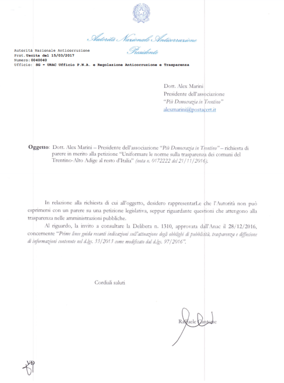 L’esame del fascicolo e l’elaborazione della posizione dell’Autorità sono stati curati dalla resposabile dell’ufficio dott.ssa Elisabetta Midena e sono stati sottoposti al vaglio del Consiglio dell’Autorità. L’iter di trattazione del parere per la petizione regionale “Uniformare le norme sulla trasparenza dei comuni del Trentino-Alto Adige al resto d’Italia” si è infine concluso con una nota inoltrata all’associazione in data 15 marzo a firma del presidente Raffaele Cantone.