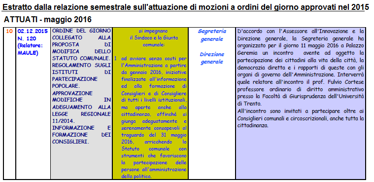 Pur senza entrare, in questa sede, in valutazioni politiche, si osserva che la prospettata riforma dello Statuto comunale non è stata ancora approvata dal Consiglio comunale pur essendo stata ampiamente discussa sia nelle riunioni della Commissione permanente dei capigruppo di data 6 e 20 giugno 2016 che all’interno dei singoli gruppi, nell’intento di dare attuazione all’ordine del giorno approvato con la deliberazione consiliare 2.12.2015 n. 119 sopra richiamata che prevedeva l’approvazione delle modifiche statutarie sul tema del referendum entro il mese di maggio 2016. I Servizi competenti, pertanto, non hanno potuto elaborare il complesso delle «schede informative» sugli istituti di democrazia rappresentativa e diretta concernenti l’ordinamento comunale di Trento, citate nella Relazione semestrale sull’attuazione delle mozioni e ordini del giorno (ed. giugno 2016). soprarichiamata.