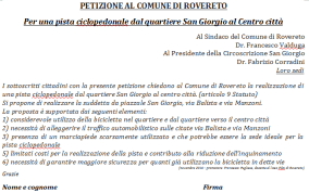 Nel febbraio scorso, ai sensi dello Statuto1 e dell’art. 17 regolamento per l’esercizio dei diritti di informazione e di partecipazione dei cittadini2, il professor Francesco Pugliese presentava al sindaco e al presidente della circoscrizione San Giorgio una petizione supportata da oltre 400 firme con la quale si chiedeva la realizzazione di una pista ciclabile tra San Giorgio e il centro della città di Rovereto, lungo via Balista e via Manzoni (testo petizione).