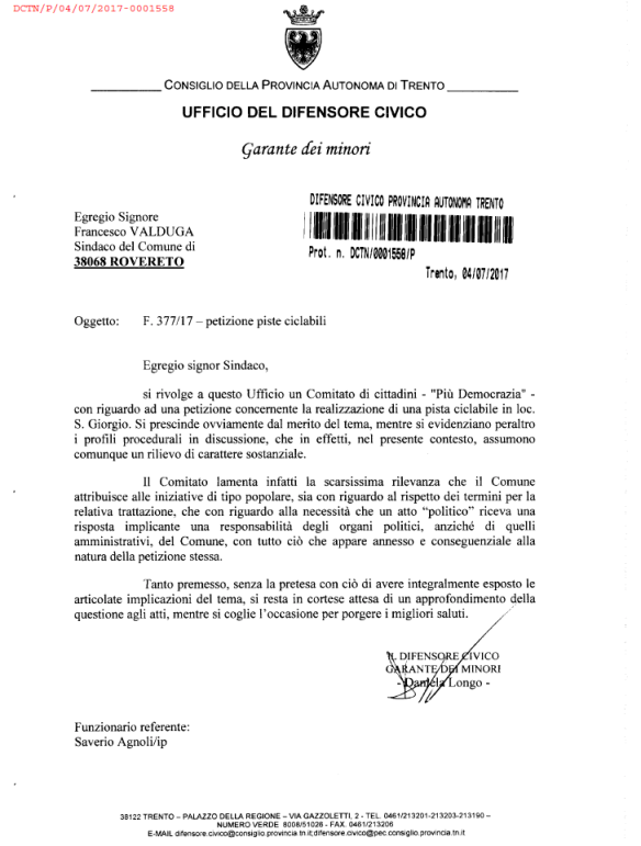 Al fine di favorire una piena realizzazione dei diritti di partecipazione dei cittadini ai pubblici poteri e alla gestione degli affari collettivi si chiede al Difensore Civico di intervenire presso l’amministrazione comunale di Rovereto e di adottare iniziative di più ampia portata, ad esempio sollecitando l’amministrazione provinciale a intervenire nei confronti delle altre amministrazioni dei comuni e delle comunità di valle, per raccomandare l’adozione di procedure e di buone pratiche affinché sia assicurata la piena tutela del diritto di petizione.