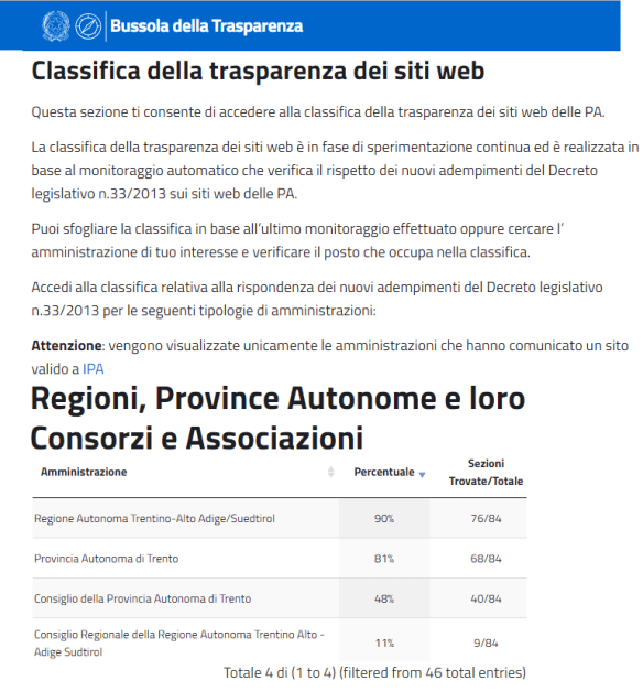 Fonte: Bussola della Trasparenza – classifica stilata dal Ministero per la Semplificazione e la PA