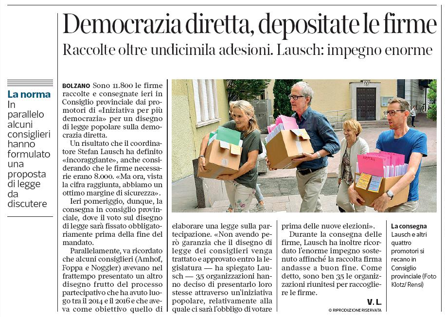 Nonostante le difficoltà e gli ostacoli il 4 settembre i Proponenti hanno depositato in Consiglio provinciale a Bolzano oltre 11.000 firme (ne bastavano 8.000) per chiedere che le iniziative legislative in materia di democrazia diretta vengano discusse in Consiglio.