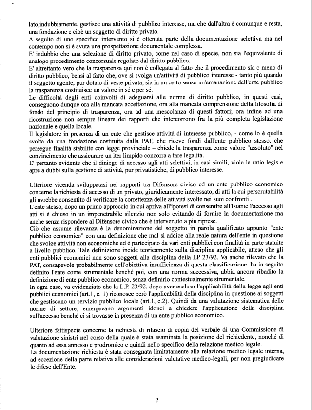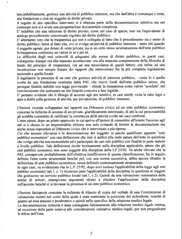A causa della farraginosità tecnica-burocratica o della volontà di sottrarsi all’accesso degli atti da parte delle PPAA e dei soggetti ad esse equiparate la situazione non pare così rassicurante come, invece, aveva affermato Ugo Rossi. Nel mese di agosto, il presidente aveva infatti scritto in una nota al presidente della Prima commissione che il riferimento alle relazioni annuali del Difensore Civico per esprimere un giudizio in materia di trasparenza appariva fuorviante.