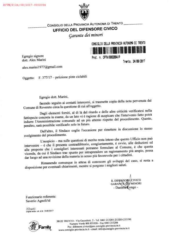 Nella risposta al Difensore Civico, il sindaco ha fatto riferimento anche all’interrogazione n.33/2017 presentata dal consigliere comunale Paolo Vergnano in ordine all’inadeguata trattazione della petizione sulla ciclabile di San Giorgio e rispetto alla quale i proponenti sono tornati alla carica nei giorni scorsi (San Giorgio al sindaco: «La ciclabile serve subito» – Trentino, 19 ott ’17).