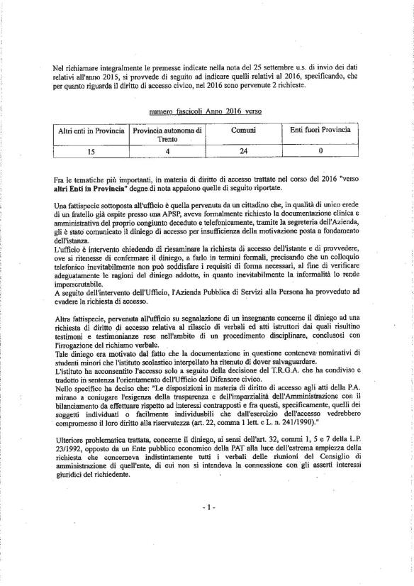 La seconda parte è stata consegnata al presidente della Prima commissione del Consiglio provinciale il 23 ottobre scorso. Nelle premesse del documento (pdf – 6 pagine), il Difensore Civico ha passato in rassegna i casi affrontati dall’ufficio nel corso del 2016 suddividendoli in tre categorie principali: verso altri Enti in Provincia; verso l’ente Provincia Autonoma di Trento; verso i Comuni.