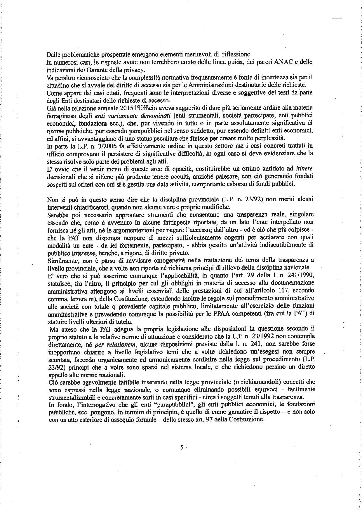 - in riferimento al combinato delle disposizioni contenute nella L.241/1990 e nella Lp.23/1992, non sarebbe inopportuno chiarire a livello legislativo temi che a volte richiedono un’esegesi non sempre scontata, facendo organicamente e armonicamente confluire nella legge sul procedimento (Lp.23/1992) principi che a volte sono sparsi nel sistema locale, o che richiedono persino un diretto appello alle norme nazionali;