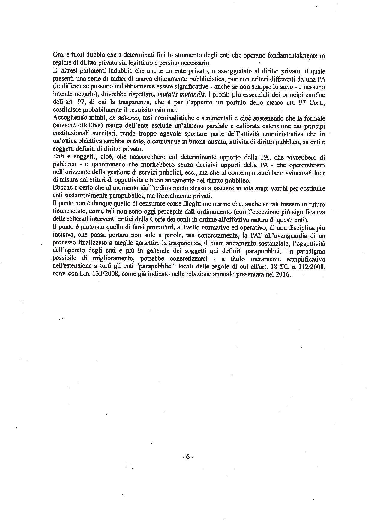 - ritiene che gli enti variamente denominati (enti strumentali, società partecipate, enti pubblici economici, fondazioni, etc.), pur vivendo in tutto o in parte assolutamente significativa di risorse pubbliche, pur essendo parapubblici, pur essendo definiti enti economici ed affini, si avvantaggiano di uno status peculiare che finisce per creare molte perplessità. In tal senso, giudica ovvio che il venir meno di queste aree di opacità, costituirebbe un ottimo antidoto ad itinere decisionali che si ritiene più prudente tenere occulti, anziché palesare, con ciò generando fondati sospetti su criteri su cui si è gestita una data attività, comportante esborso di fondi pubblici;