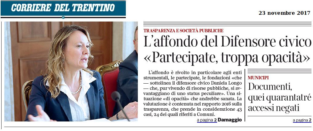 Su sollecitazione della nostra associazione, Mattia Civico, presidente della commissione consiliare incaricata di trattare la petizione “Per un Trentino trasparente”, aveva chiesto al Difensore Civico di produrre una relazione in ordine all’applicazione della normativa in materia di trasparenza in provincia di Trento. Il fine era di fornire elementi analitici per affrontare le problematiche messe in luce nella petizione popolare e favorire l’individuazione dei corrispondenti interventi normativi o regolamentari per assicurare l’efficacia delle leggi esistenti.