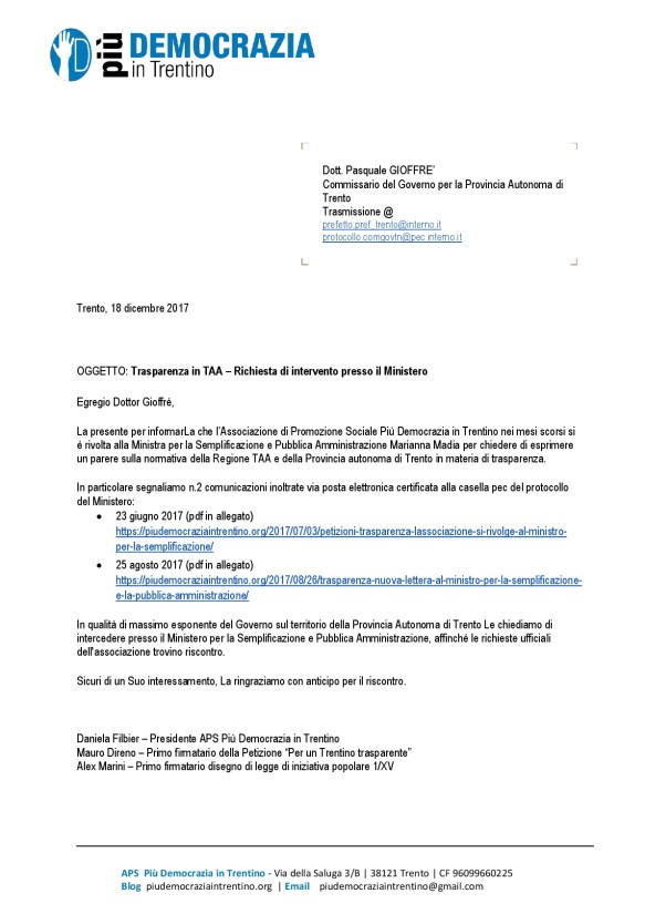 Nella lettera del 23 giugno 2017 l’associazione chiedeva un parere del Governo rispetto alla conformità delle leggi locali al dettato costituzionale e alle disposizioni statali in materia di trasparenza. Chiedeva inoltre la disponibilità a partecipare a un Terzo Tempo a Trento al fine di sensibilizzare i rappresentanti istituzionali locali ad adeguare le leggi locali in materia di trasparenza e anticorruzione agli standard nazionali, invitando il presidente di ANAC Raffaele Cantone o un rappresentante da lui delegato.