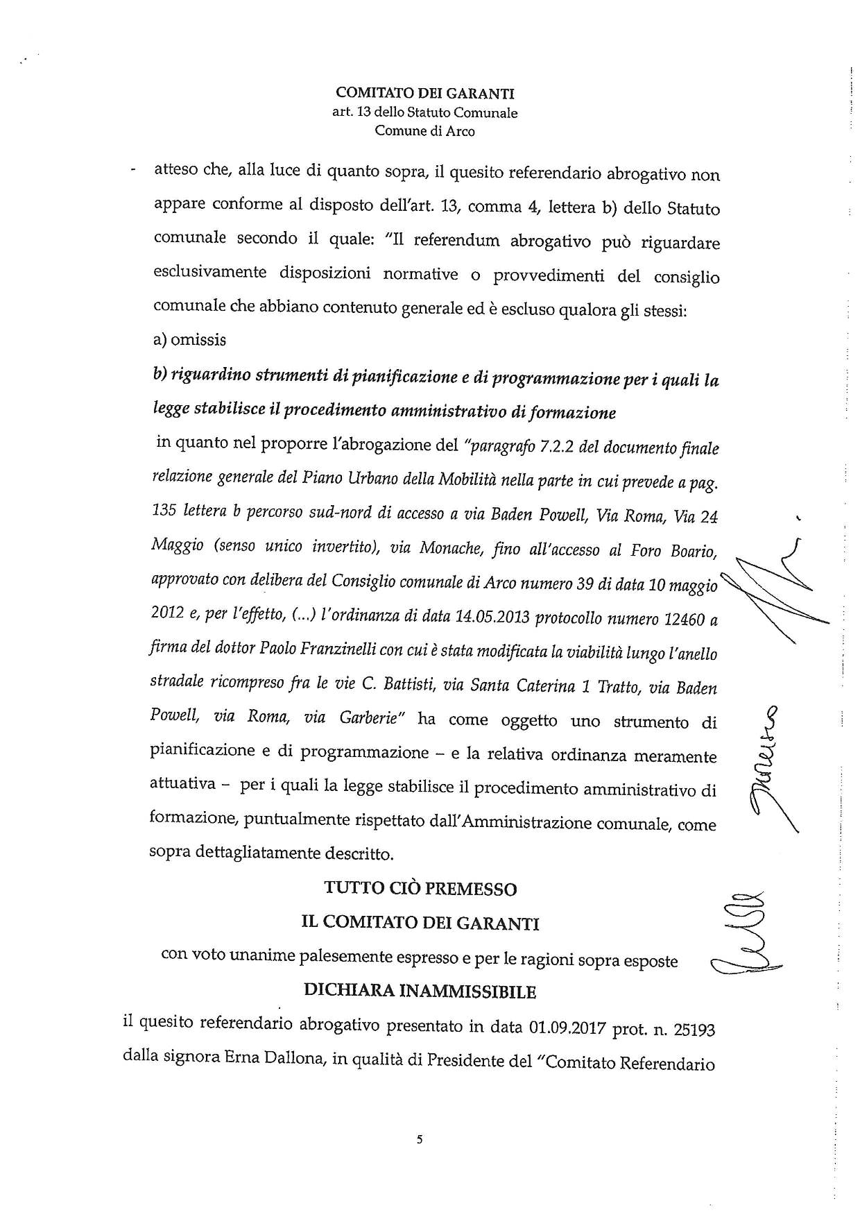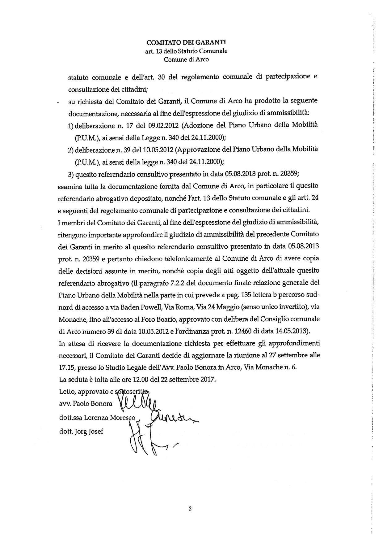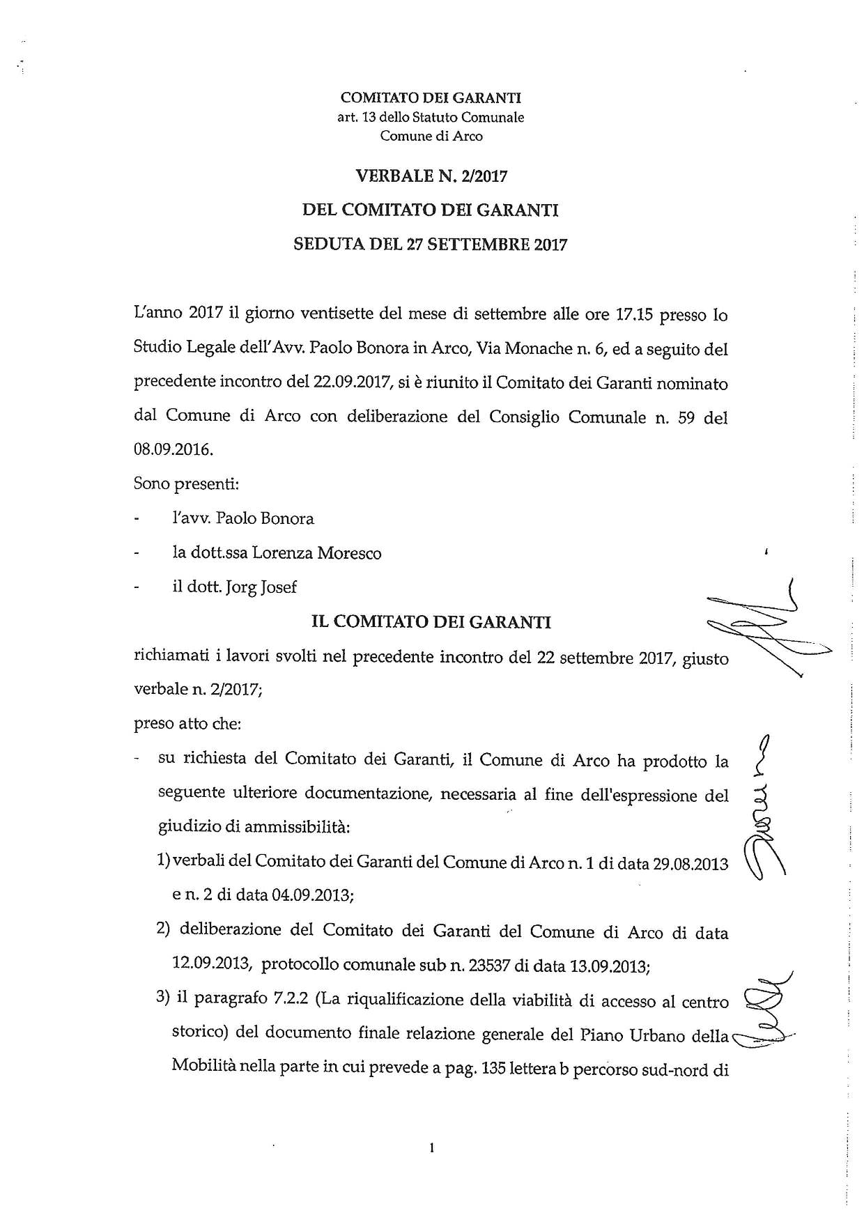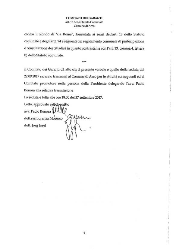 Il Comitato dei garanti – già nominato con deliberazione del Consiglio comunale n. 59 dell’8 settembre 2014 e costituito dall’avv. Paolo Bonora, dalla segretaria comunale di Riva del Garda dott.ssa Lorenza Moresco e dall’ex vice-sindaco dott. Jorg Josef – si è riunito il 22 e il 27 settembre 2017 presso lo studio legale dell’avv. Paolo Bonora ad Arco esaminando la richiesta di referendum e dichiarandola inammissibile.