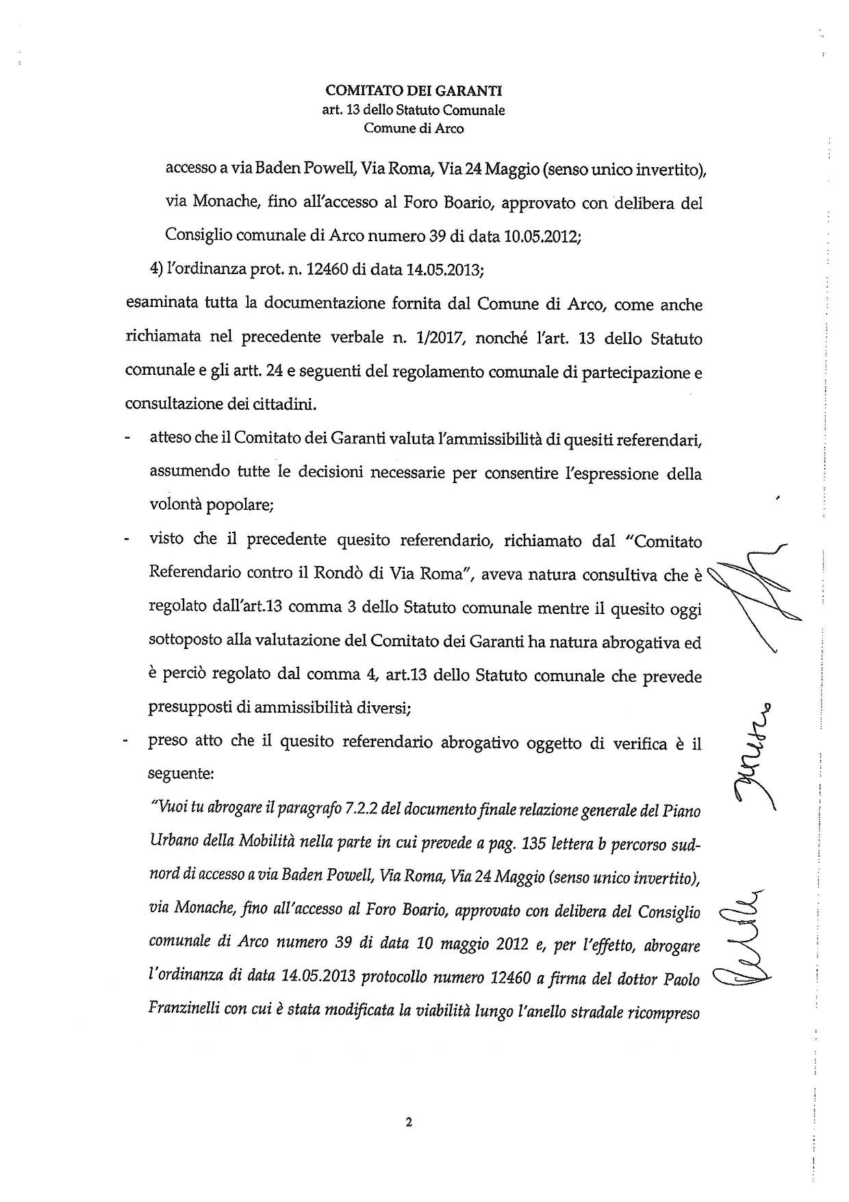Il comitato referendario Contro il Rondò di via Roma, per mezzo della presidente sig.ra Erna Dallona, aveva depositato la richiesta di referendum abrogativo in data 1 settembre 2017 (prot. Comune di Arco 25193/2017) sottoponendo alla valutazione del comitato dei garanti del Comune di Arco il seguente quesito: