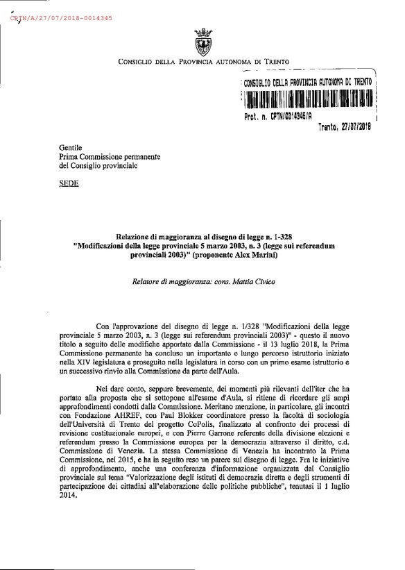 La settimana scorsa i capigruppo del Consiglio provinciale di Trento avevano deciso di cassare definitivamente il disegno di legge sulla democrazia diretta optando per non portare in aula il testo concordato con il promotori in Prima commissione. Sebbene la portata della proposta iniziale fosse stata sensibilmente ridimensionata per poter andare incontro alle preoccupazioni di chi temeva un’escalation democratica nel governo provinciale, i capigruppi avevano comunque ritenuto bloccare l’iter del disegno di legge decretandone di fatto la morte. A riaccendere le speranze, però, dopo il tentativo del consigliere Degasperi, ci ha pensato il presidente della Prima commissione Mattia Civico. Nella giornata di ieri il consigliere Civico ha lanciato il seguente appello al presidente Dorigatti e ai capigruppo:
