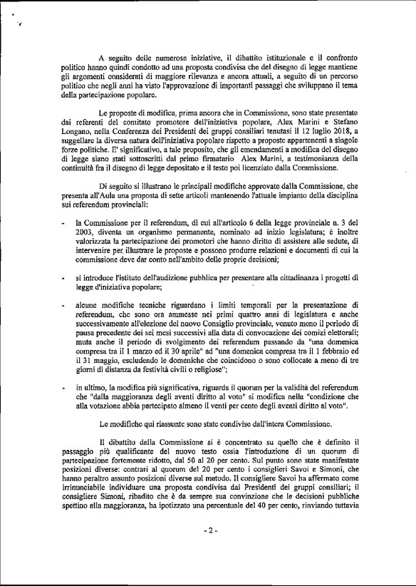 Per molti mesi in commissione abbiamo lavorato con il comitato proponente per arrivare ad una mediazione e devo a tal proposito sottolineare l’approccio costruttivo e responsabile sia dei consiglieri sia del comitato proponente.