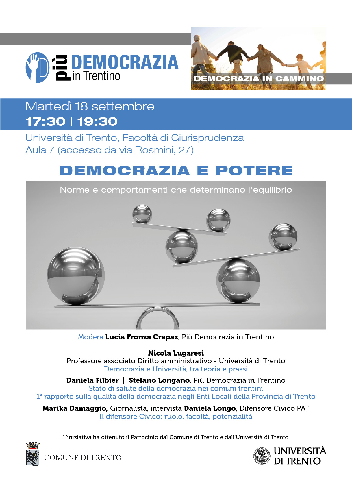 Martedì 18 settembre abbiamo organizzato un Convegno che riteniamo particolarmente interessante. Titolo “Democrazia e Potere”. Un tema delicatissimo, intrigante e poco dibattuto. Saremo ospiti dell’Università di Trento a partire dalle 17:30.Un attestato che certifica il valore culturale e civico di questa iniziativa.