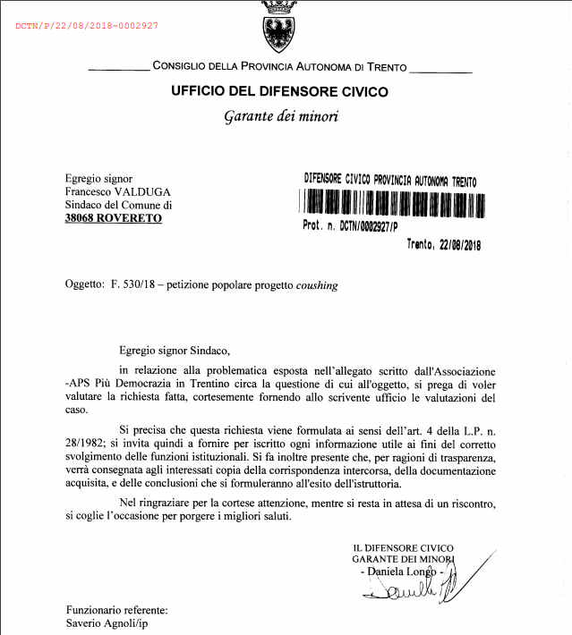 Il Difensore Civico ha valutato la segnalazione e il 22 agosto ha scritto al Sindaco Valduga sollecitandolo a fornire all’ufficio “le motivazioni del caso”.