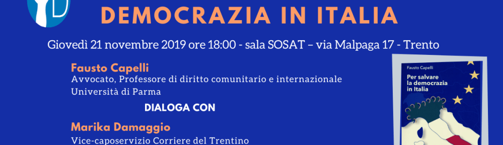 L’occasione è data dalla disponibilità di Fausto Capelli, Professore di Diritto internazionale e Comunitario presso l’Università di Parma (chi è Fausto Capelli) a presentare, a Trento, il suo ultimo libro “Per salvare la democrazia in Italia. Cultura dell’etica e della legalità in un mondo dominato dalla politica e dall’economia”
