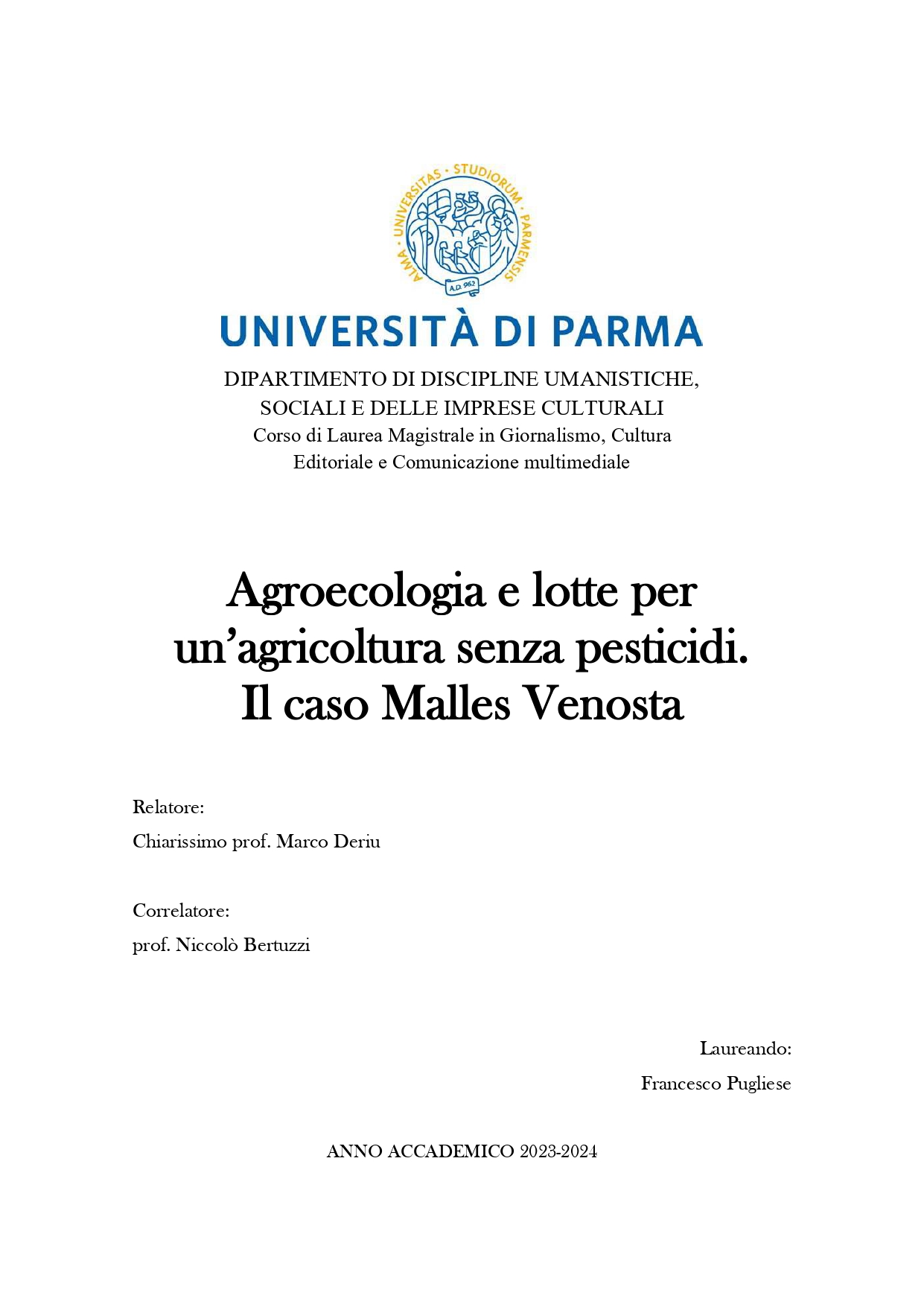 La tesi di Pugliese si presenta come uno studio-ricerca dell’esperienza di lotta contro i pesticidi nel Comune di Malles (Val Venosta, Provincia autonoma di Bolzano) nel quadro generale delle lotte ambientaliste e per un’agricoltura senza pesticidi. Il lavoro parte dalla figura pionieristica di Rachel Carson, prima voce ad avvertire il mondo sui pericoli dei pesticidi nel 1962, per poi approfondire le conseguenze sulla salute umana e sull’ambiente di queste sostanze, con particolare attenzione al caso del DDT e del glifosato.