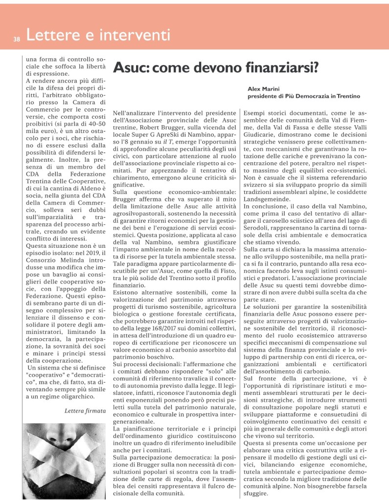 In conclusione, il caso della val Nambino, come prima il caso del tentativo di allargare il carosello sciistico all’area del lago di Serodoli, rappresentano la cartina di tornasole della crisi ambientale e della crisi democratica che stiamo vivendo. Sulla carta si dichiara la massima attenzione allo sviluppo sostenibile. Nella pratica si fa il contrario e si punta dritto alla resa economica facendo leva sugli istinti consumistici e predatori della specie umana. L’associazione provinciale delle Asuc su questi temi dovrebbe dimostrare di non avere dubbi sulla scelta da che parte stare.