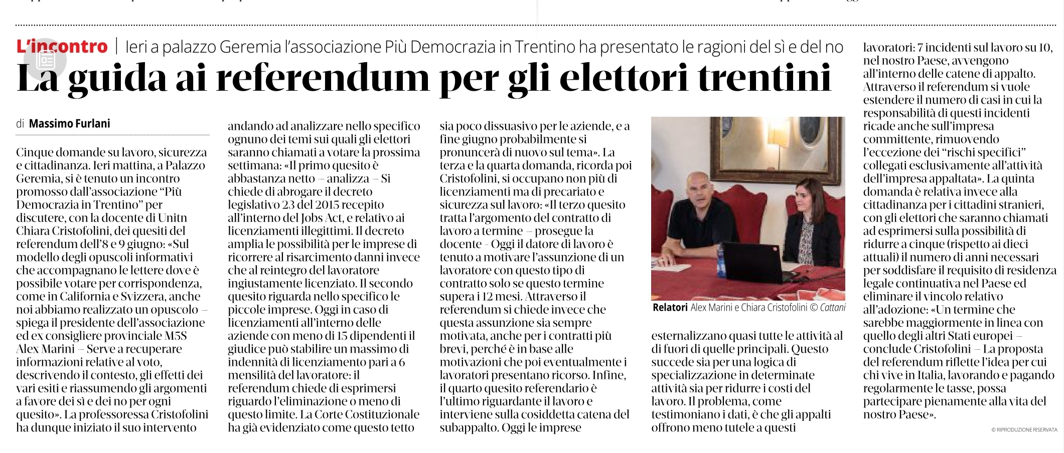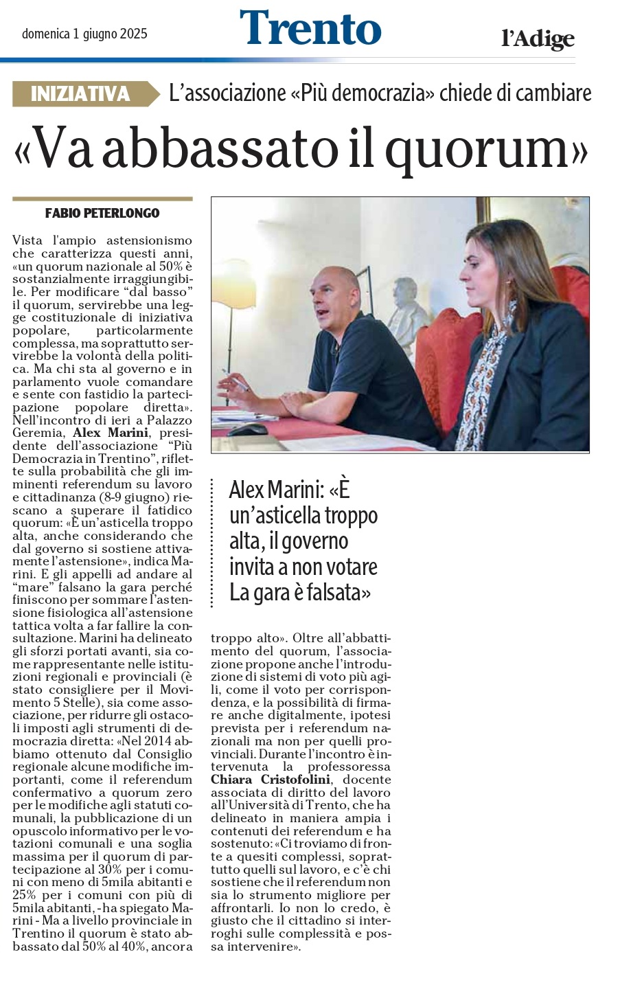 Anche la carta stampata ha garantito un importante spazio di informazione. In particolare, vogliamo ringraziare Fabio Peterlongo de L’Adige che, con il suo articolo, ha posto il focus sulla nostra richiesta di abbassare il quorum, evidenziando l’importanza di rendere i referendum più efficaci e accessibili. Contemporaneamente, Il T Quotidiano, con l’articolo a cura di Massimo Furlani, ha fornito una dettagliata Guida ai referendum per gli elettori trentini, approfondendo i singoli quesiti e offrendo un prezioso strumento informativo ai cittadini.