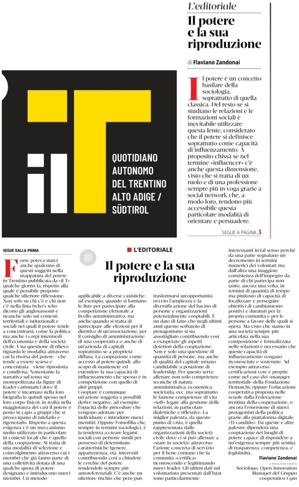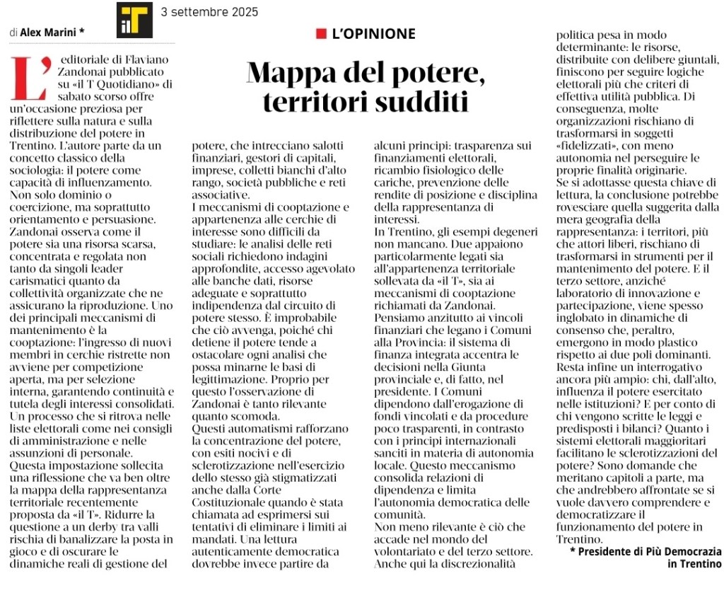 L’intervento di Flaviano Zandonai pubblicato su Il T offre un’occasione preziosa per riflettere sulla natura e sulla distribuzione del potere in Trentino. L’autore parte da un concetto classico della sociologia: il potere come capacità di influenzamento. Non solo dominio o coercizione, ma soprattutto orientamento e persuasione.