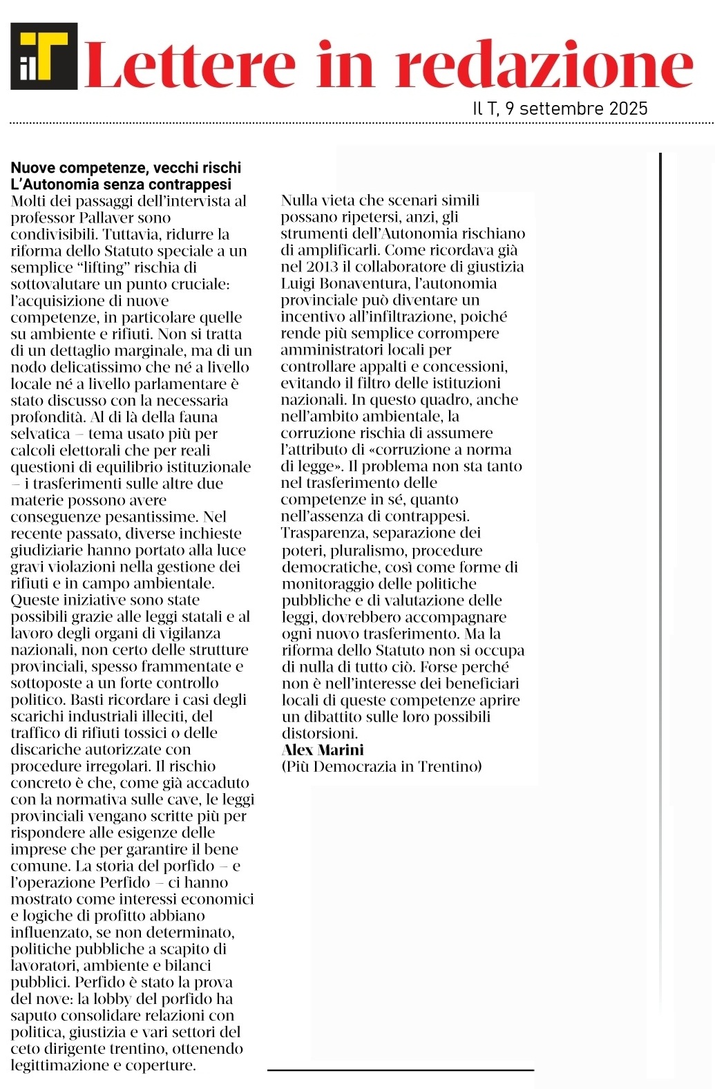 Molti dei passaggi dell’intervista al professor Günther Pallaver sono condivisibili. Tuttavia, ridurre la riforma dello Statuto speciale a un semplice “lifting” rischia di sottovalutare un punto cruciale: l’acquisizione di nuove competenze, in particolare quelle su ambiente e rifiuti. Non si tratta di un dettaglio marginale, ma di un nodo delicatissimo che né a livello locale né a livello parlamentare è stato discusso con la necessaria profondità.