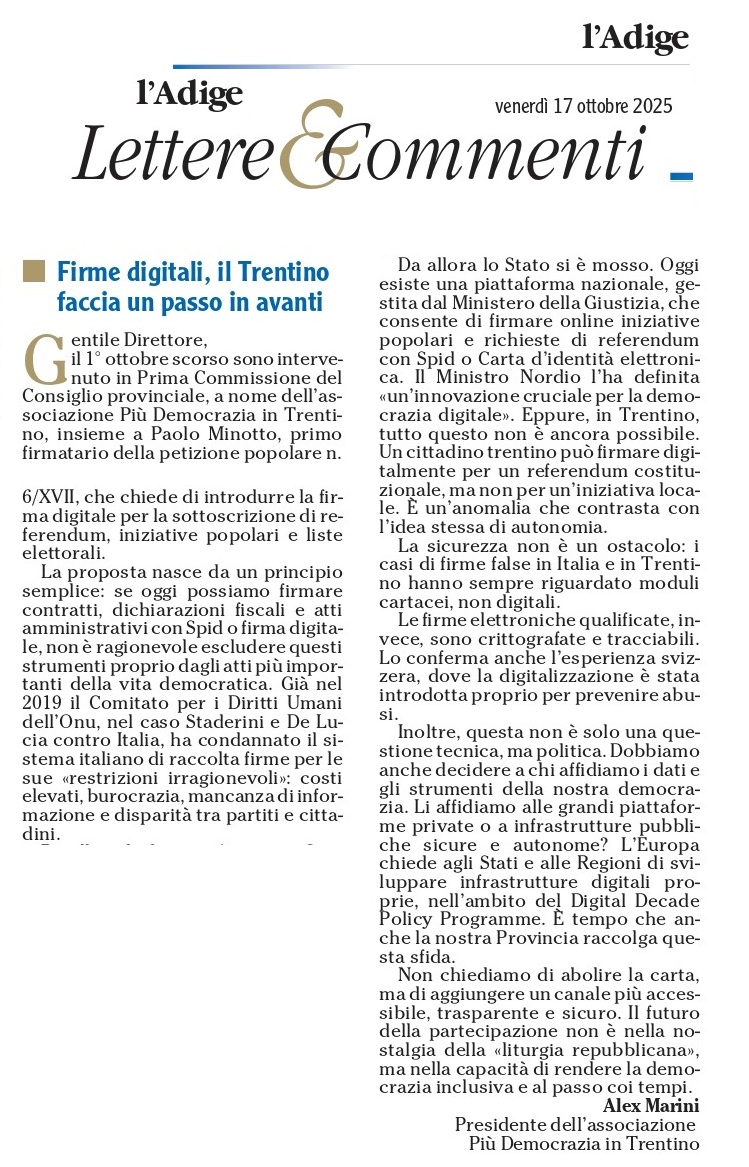 Infine, dopo i nostri interventi illustrativi, su richiesta del consigliere Paolo Zanella e del presidente della commissione Carlo Daldoss, ho inoltre predisposto e consegnato un elenco di possibili soggetti da ascoltare in audizione, affinché rimanesse agli atti della commissione e potesse orientare un confronto ampio, qualificato e trasparente sul tema della digitalizzazione democratica. L’elenco comprende Mario Staderini, promotore del ricorso all’ONU che ha portato alla condanna del sistema italiano per le sue restrizioni irragionevoli; Marco Cappato dell’Associazione Luca Coscioni, per illustrare la sentenza costituzionale sul caso Gentili che ha riconosciuto la firma digitale come tutela della dignità umana e dei diritti politici delle persone con disabilità; esperti dell’Università di Trento per un’analisi giuridica della giurisprudenza costituzionale; AGID per gli aspetti tecnici di sicurezza e standard della firma digitale; Trentino Digitale per valutare fattibilità, costi e sovranità digitale dell’implementazione provinciale; il Difensore Civico provinciale per il quadro delle tutele dei diritti fondamentali; Maria Chiara Prodi e Filippo Ciavaglia del CGIE per l’esperienza dei cittadini all’estero nella partecipazione a distanza; e l’Osservatorio provinciale sui diritti delle persone con disabilità di Bolzano, quale modello virtuoso di attuazione della Convenzione ONU, a confronto con l’inattività del Coordinamento trentino previsto per legge ma mai operativo.