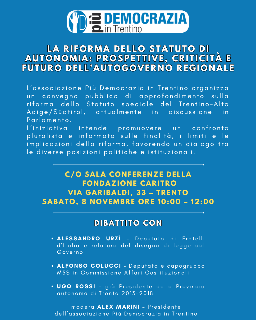 L’associazione Più Democrazia in Trentino organizza un convegno pubblico dedicato alla riforma dello Statuto speciale del Trentino-Alto Adige/Südtirol, attualmente in discussione in Parlamento.
