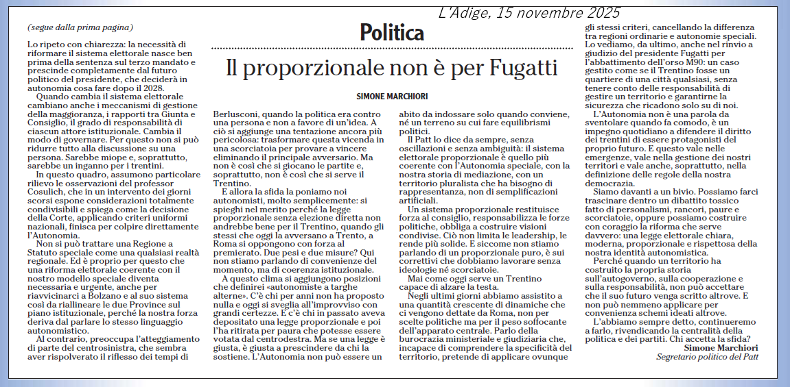 Non intendiamo fare una difesa acritica della Corte costituzionale: ogni decisione può e deve essere discussa nel merito. Ciò che colpisce, però, è che il segretario del PATT eviti qualunque analisi giuridica e scelga invece di liquidare la Consulta con un’etichetta denigratoria. Le sentenze possono essere criticate, ma solo entrando nei contenuti. In questo caso, il merito è chiaro ed è perfettamente coerente con gli standard internazionali sulle garanzie democratiche, inclusi quelli della Commissione di Venezia. Ricorrere a definizioni sprezzanti non argomenta nulla: è solo un modo per sottrarsi al confronto e finisce per squalificare non la Corte, ma il rispetto delle istituzioni da parte di chi usa quel linguaggio.