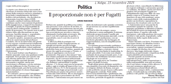 Infine, Marchiori difende il proporzionale, ma specifica subito che “non sarà un proporzionale puro”. Vale a dire: un maggioritario camuffato. Se l’obiettivo è rafforzare pluralismo e autonomia, allora serve coerenza, non slogan.