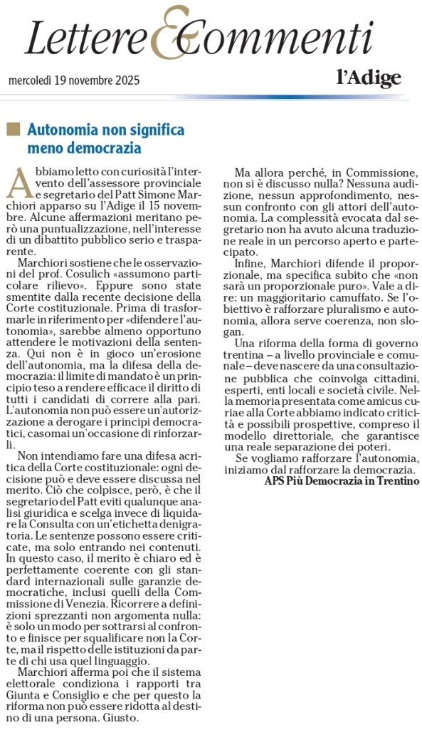 * lettera pubblicata sul quotidiano L’Adige il 19 novembre 2025