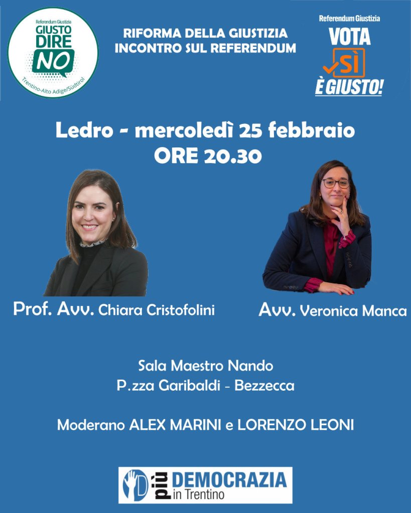 Confronto tra l’avv. Veronica Manca (per il Sì) e la prof. avv. Chiara Cristofolini (per il No). - Giovedì 26 febbraio – Borgo Valsugana (ore 20:30)