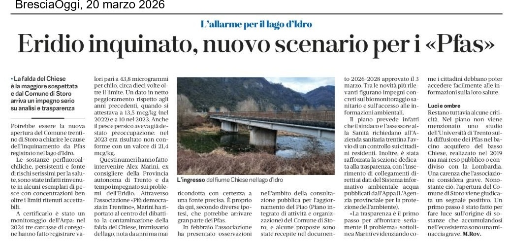 All’inizio di febbraio Più Democrazia in Trentino aveva presentato al Comune di Storo una serie di osservazioni nell’ambito della consultazione pubblica sul PIAO (Piano Integrato di Attività e Organizzazione) per l’aggiornamento dello stesso. Le osservazioni (pdf con osservazioni integrali) riguardavano in particolare l’obbligo di pubblicazione delle informazioni ambientali rilevanti, tra cui dati e analisi sulla contaminazione da PFAS nella falda idrica del fiume Chiese.