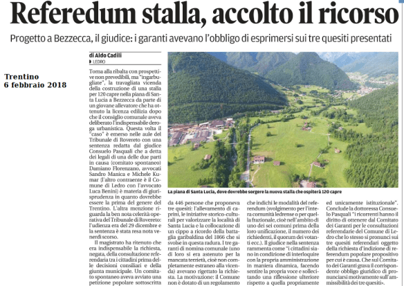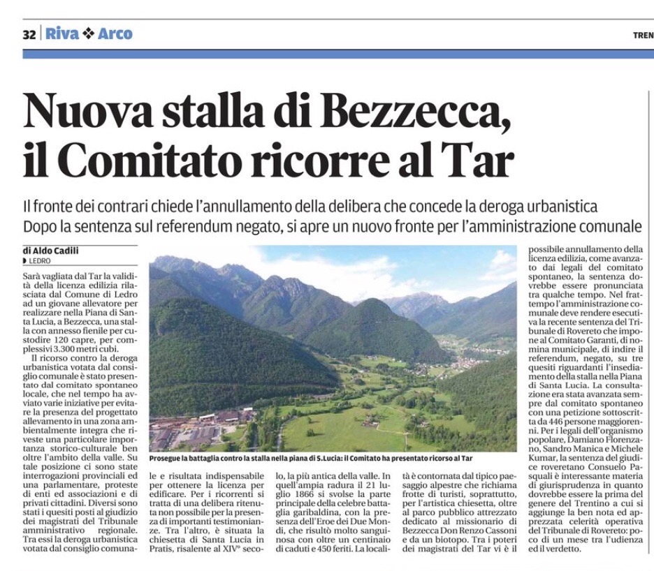 Nuova stalla di Bezzecca, il Comitato ricorre al Tar