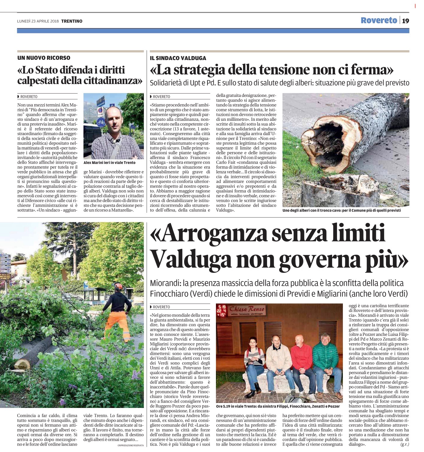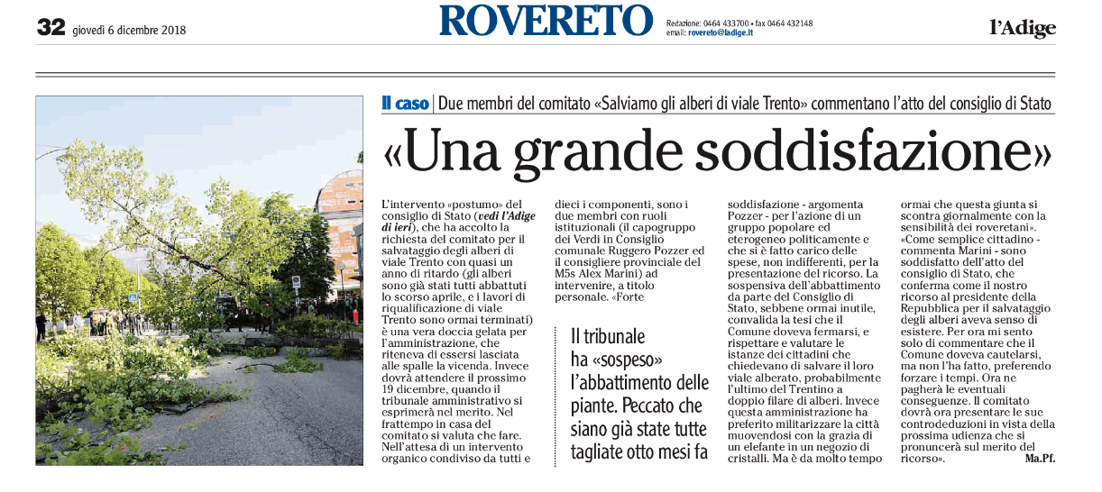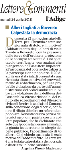 Alberi tagliati a Rovereto. Calpestata la democrazia