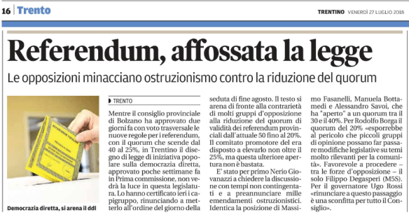 REFERENDUM PROVINCIALI: QUORUM RESTA A 50%