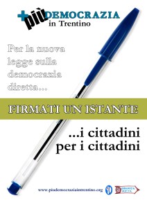 Consiglieri comunali – ed altri soggetti autorizzati all’autenticazione delle firme come ad esempio funzionari provinciali o assessori – di qualsiasi schieramento politico che sono motivati a partecipare alla raccolta delle firme sono invitati a segnalarci la loro disponibilità: piudemocraziaintrentino@gmail.com